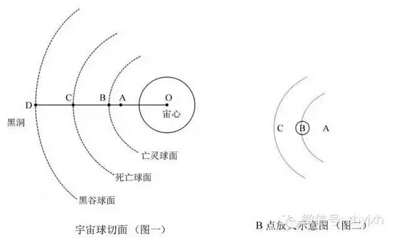 由于宙心的時間速度為0,因而在時間上表現為無始無終如如不動,佛經上稱為無量壽。宇宙中的一切生命來源于宙心,從宙心向十方有1000條生命光子流組成的生命天河。生命天河終止在A點所在的球面上。在A點球面和B點球面之間是生命的光的海洋。生命光子流很難進入B點球面,B點球面是宙心生命體外流的屏障,生命光音能量體要進入B點,必須克服這個時間屏障,從而衰減大量的能量。C 點球面是宇宙生命外流的第二層屏障,進入C 點的生靈能量很低,基本上屬于死靈體。C 點球面以外D 球面屬于無靈區,無靈區是封閉宇宙生命能量的最后一道屏障。D點球面是宇宙的邊界,D點以外是黑洞,無邊無際的黑洞。宇宙的D球面相當于宇宙的皮甲,這層皮甲保護著宇宙的子民。
